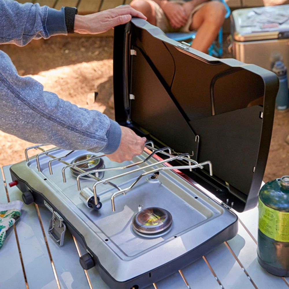 sku: 32419Hit the road with the Coleman Triton+ 2-Burner Propane Gas Camping Stove, which makes it easy to cook great meals outdoors. Its built-in carry handle makes it easy to bring the stove along on your adventures, and its durable, chrome-plated grate is removable for easy cleanup. Because we know cooking out in the elements can be rough, this stove has two guards to shield the burners and flame from the wind, as well as a heavy-duty latch so you can keep the stove closed if you step away for a minute. The best part? This stove has 22,000 total BTUs of cooking power and a push-button Instastart ignition for automatic, matchless lighting so you don't have to worry about bringing along matches or a lighter when you're packing to go.