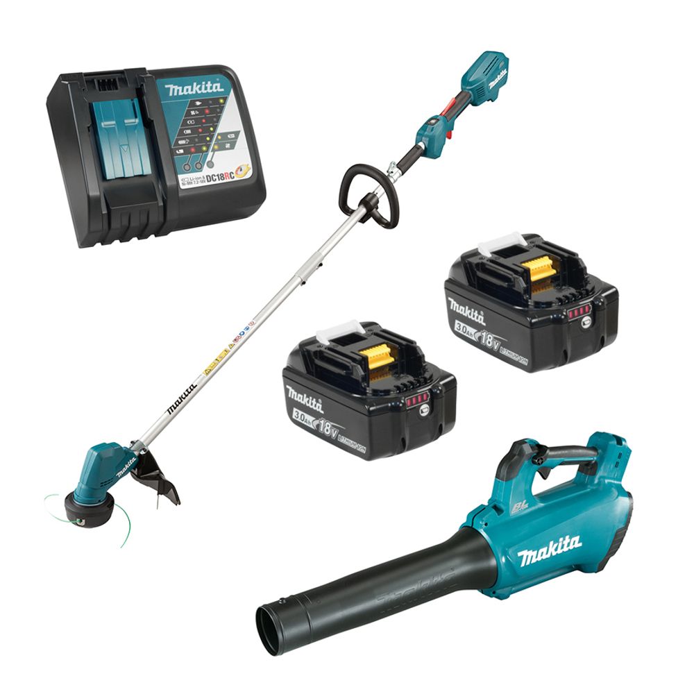 Includes: Cordless Line Trimmer with Brushless Motor (DUR192LZX1) ; Cordless Turbo Blower with Brushless Motor (DUB184Z) ; Two 18V (3.0 Ah) Li-Ion Batteries BL1830B (194205-3) ; Rapid Charger (DC18RC).